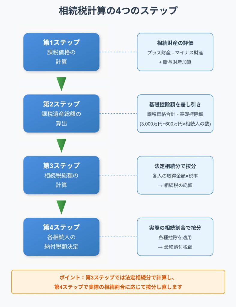 相続税の計算は、4つのステップに分けて理解することができます。第1ステップで課税価格を計算し、第2ステップで基礎控除額を差し引いて課税遺産総額を算出します。第3ステップで相続税の総額を計算し、最後の第4ステップで各相続人の納付税額を決定します。