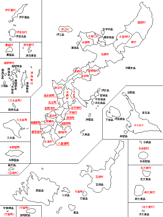 下の地図は、沖縄県のホームページにある県内の島、市町村になります。